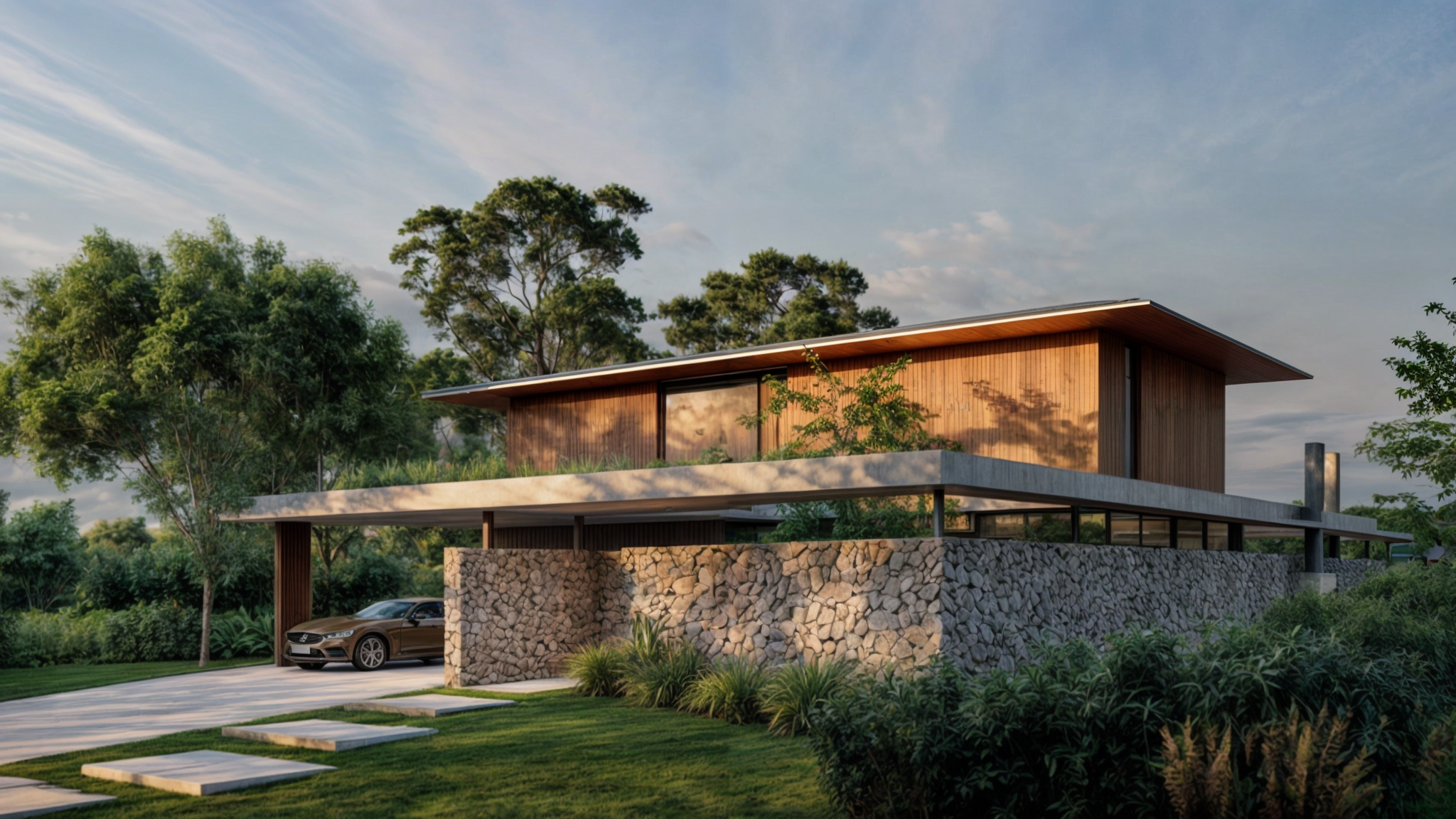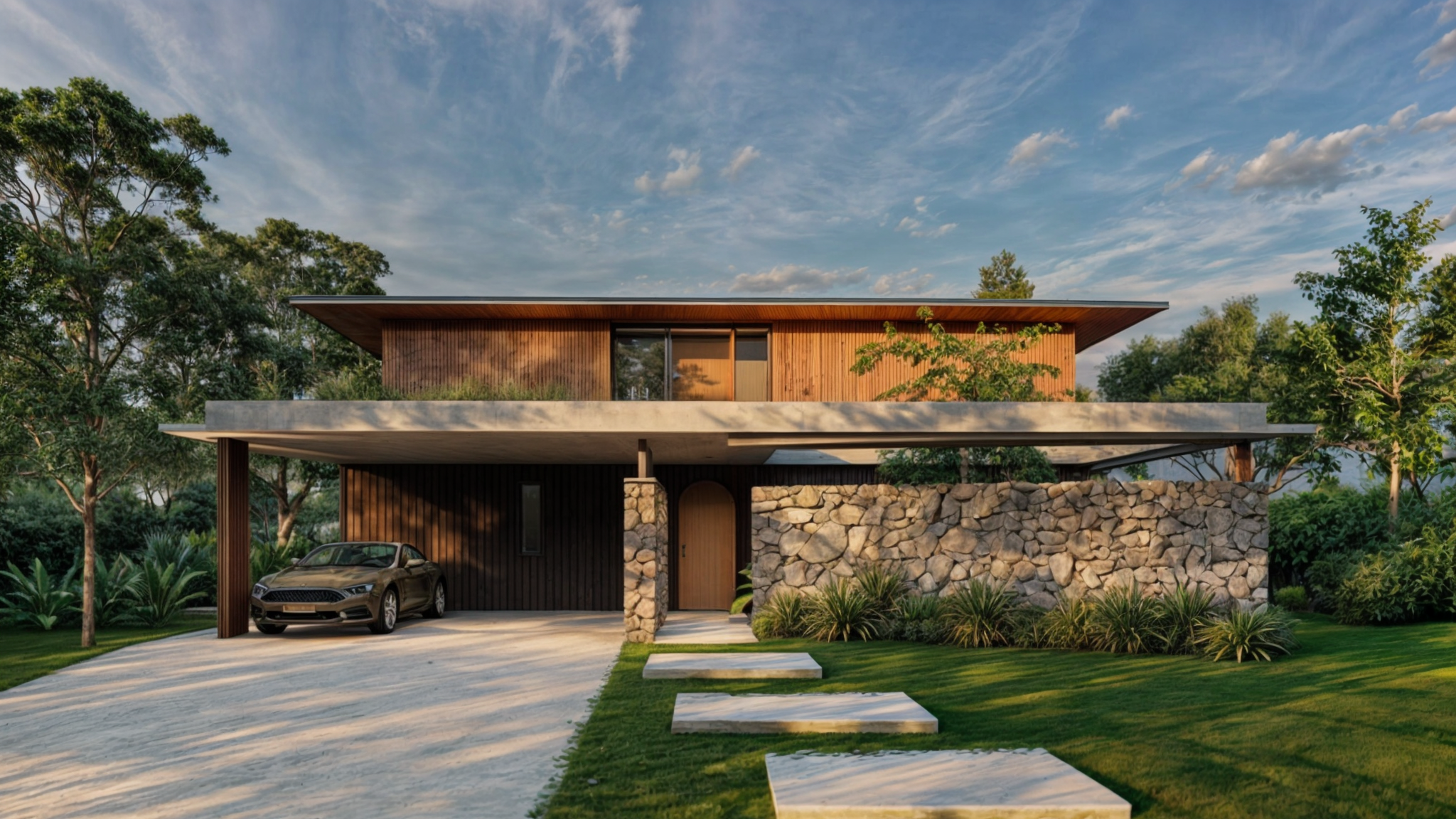 El diseño de la casa busca equilibrar la privacidad con la apertura hacia el entorno natural. La fachada está dominada por un gran muro ciego de piedra que actúa como una barrera de protección hacia el frente, pero al mismo tiempo, permite vislumbrar las formas curvas del interior de la casa. Estos detalles, inspirados en los arcos de medio punto, no solo aportan carácter visual, sino que también establecen una conexión con la arquitectura clásica, a la vez que se combinan con el lenguaje contemporáneo de la vivienda.