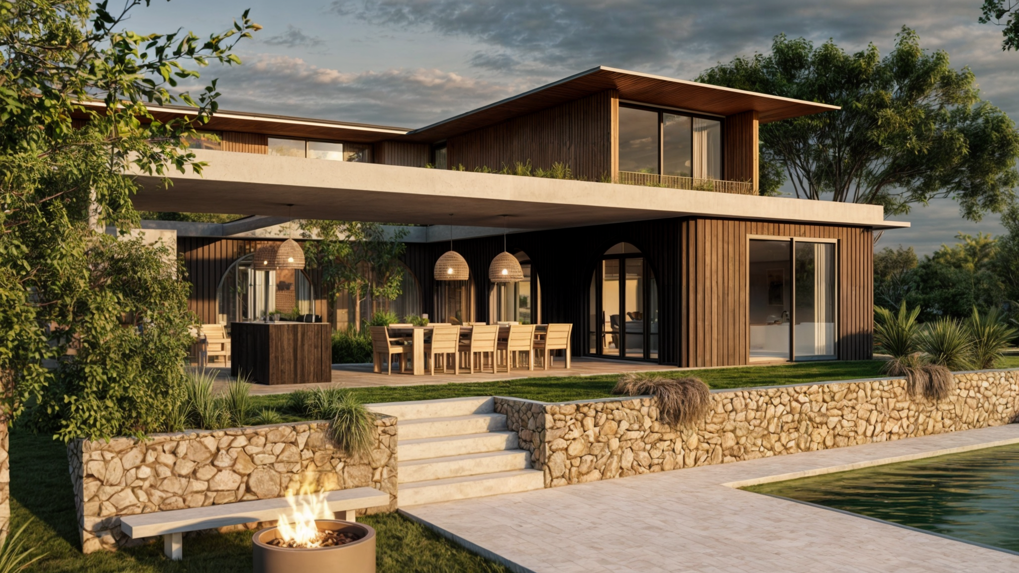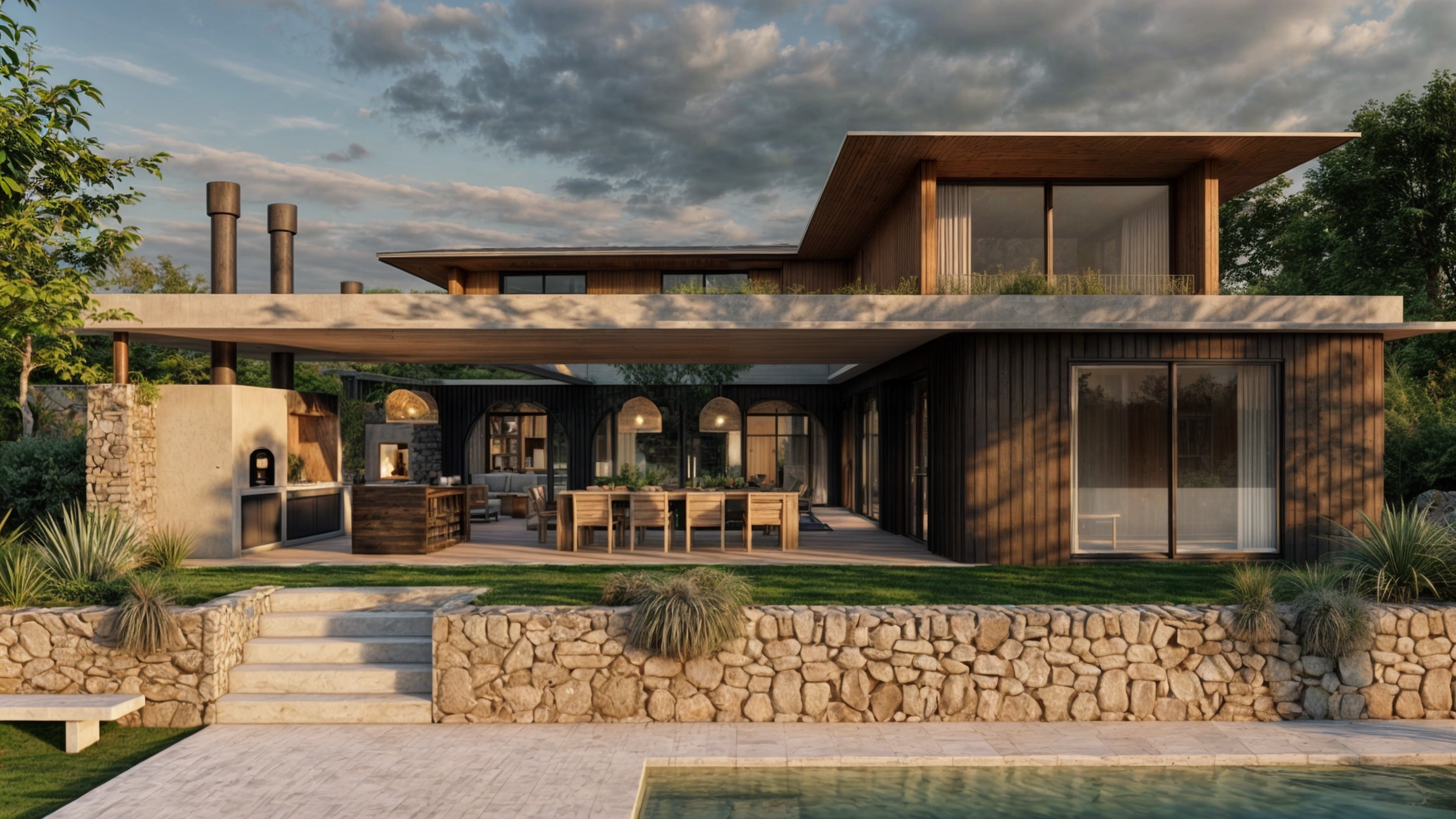 En cuanto a los materiales, se hizo una elección cuidadosa para lograr un equilibrio estético y funcional. La combinación de piedra, madera, hormigón y siding se trabajó de manera que cada material aporte tanto texturas como colores que dialogan entre sí, creando un conjunto armonioso y atemporal. Esta combinación no solo otorga calidez a los espacios interiores, sino que también refuerza la conexión con el entorno natural.