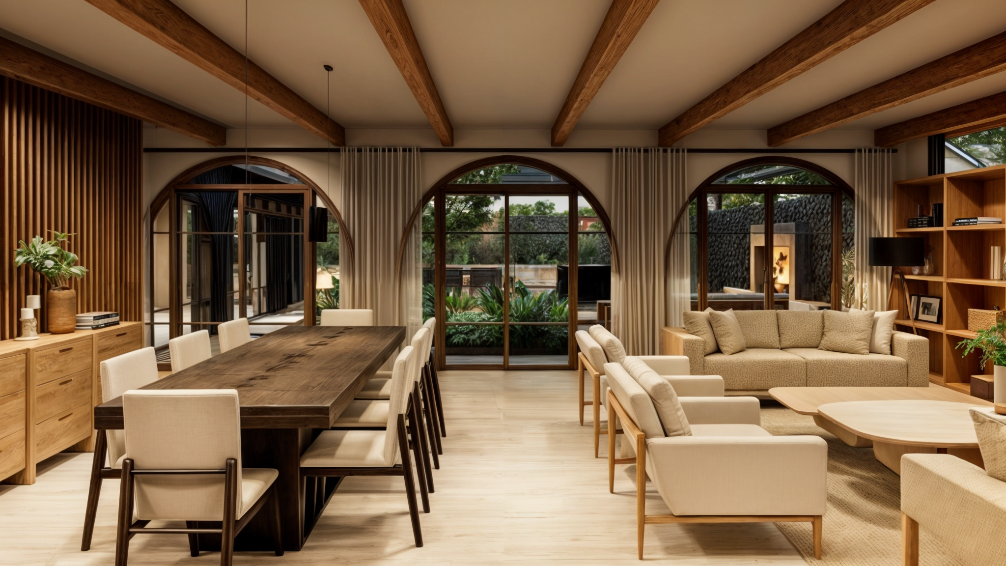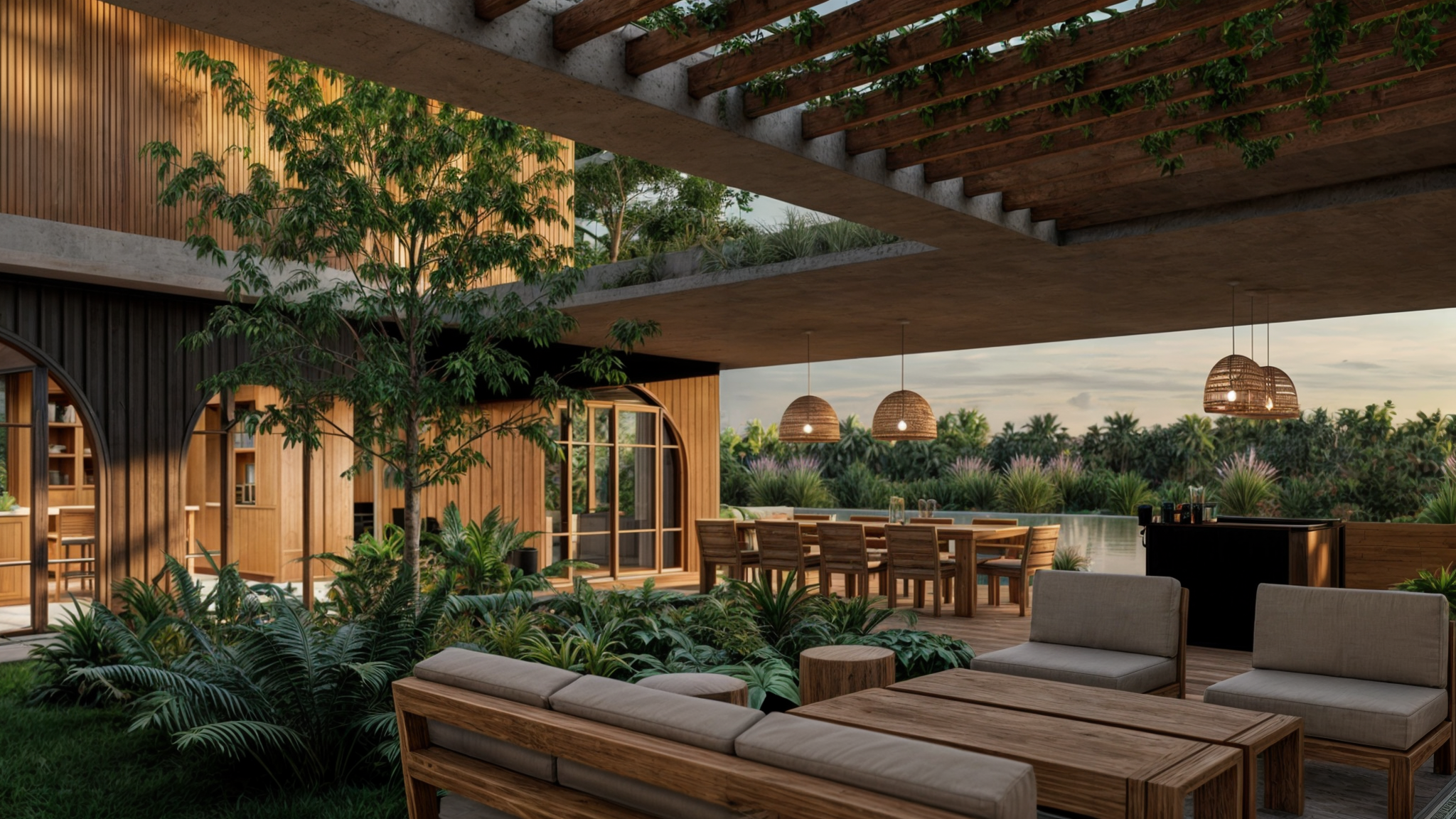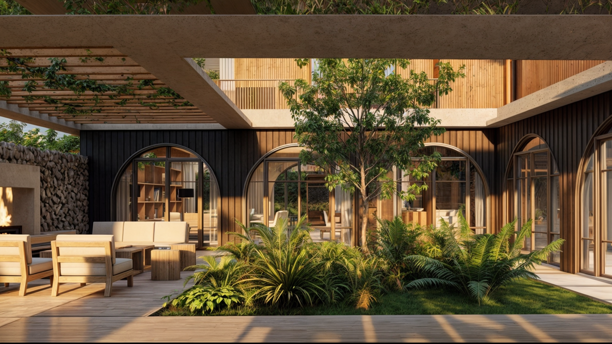 Uno de los puntos distintivos de este proyecto es la incorporación de patios verdes, un elemento recurrente en nuestros diseños, que permite que la vegetación ingrese de manera orgánica al interior de la casa. En este caso, la planta se organiza en torno a un patio central que actúa como el corazón del hogar. Desde allí, el living comedor se abre a través de los arcos hacia el patio, creando una sensación de amplitud y fluidez entre los espacios interiores y exteriores. Un sector de relax con un hogar exterior invita a disfrutar de las tardes al aire libre, mientras que la cocina, semi-integrada a un estar, también se conecta visualmente con el patio y la galería, generando una experiencia espacial coherente y envolvente.